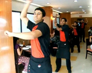 Δείτε το βίντεο, όπου οι σερβιτόροι επιδίδονται σε μια καλά δουλεμένη χορογραφία, πριν σερβίρουν τις πίτσες, κοινό θέαμα στα καταστήματα Pizza Hut της Ινδίας ιδιαίτερα στα πάρτι